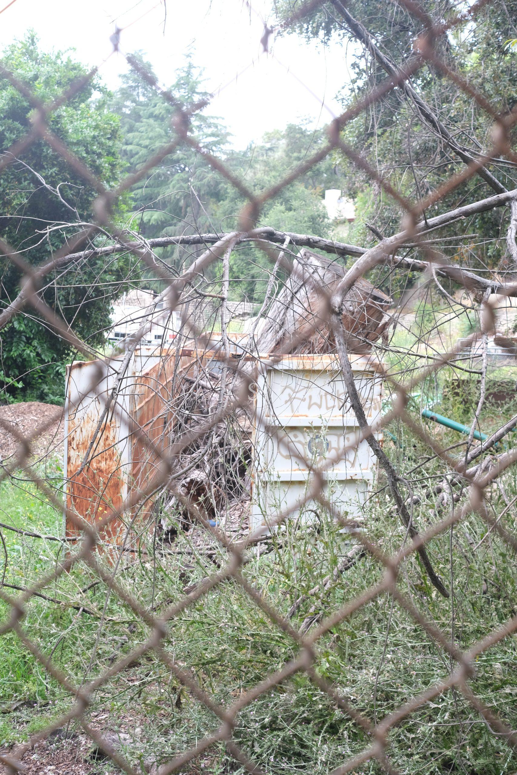 A broken tree limb rests on two white storage containers behind a metal wire fence, surrounded by overgrown grass and greenery.