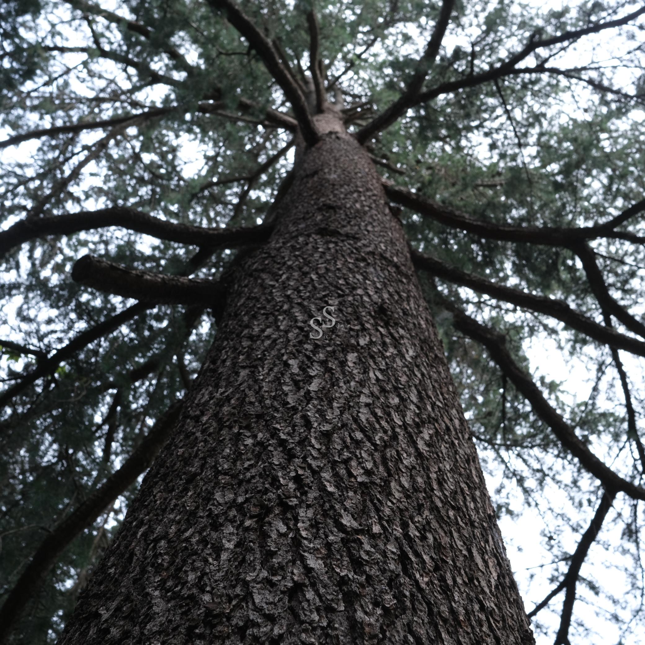 A tall tree viewed from the base looking upward, showing its textured bark and long...