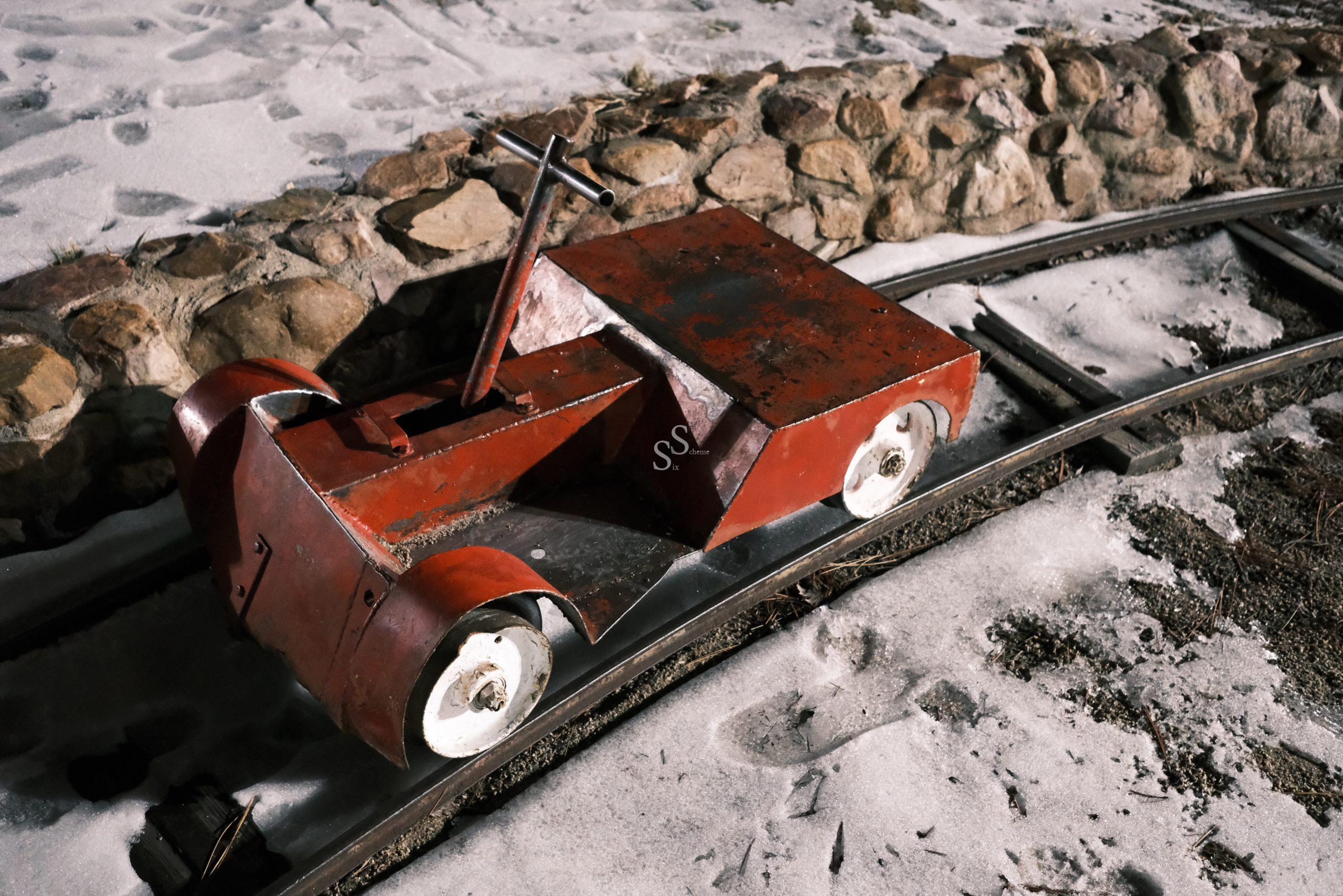 The scene captures a small, red metal handcar on a narrow-gauge track bed composed of snow and gravel. A masonry wall runs parallel to the tracks, lining the edge.