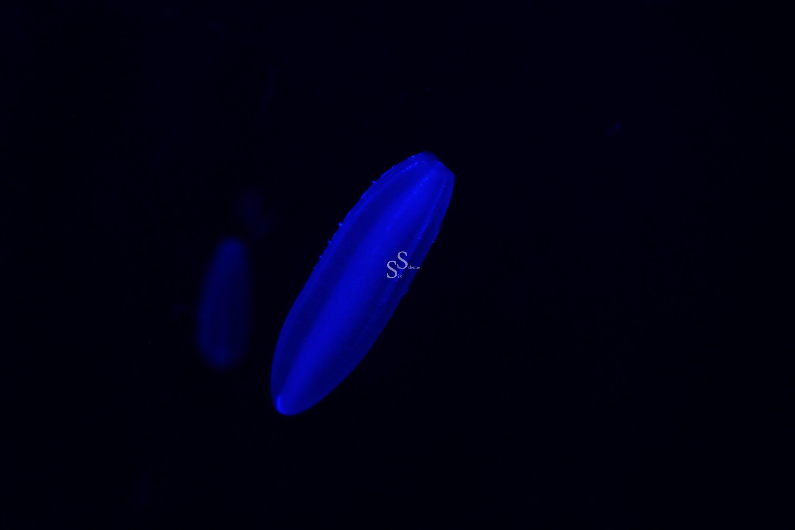 A glowing blue comb jelly floats in dark water, illuminated against a black background.