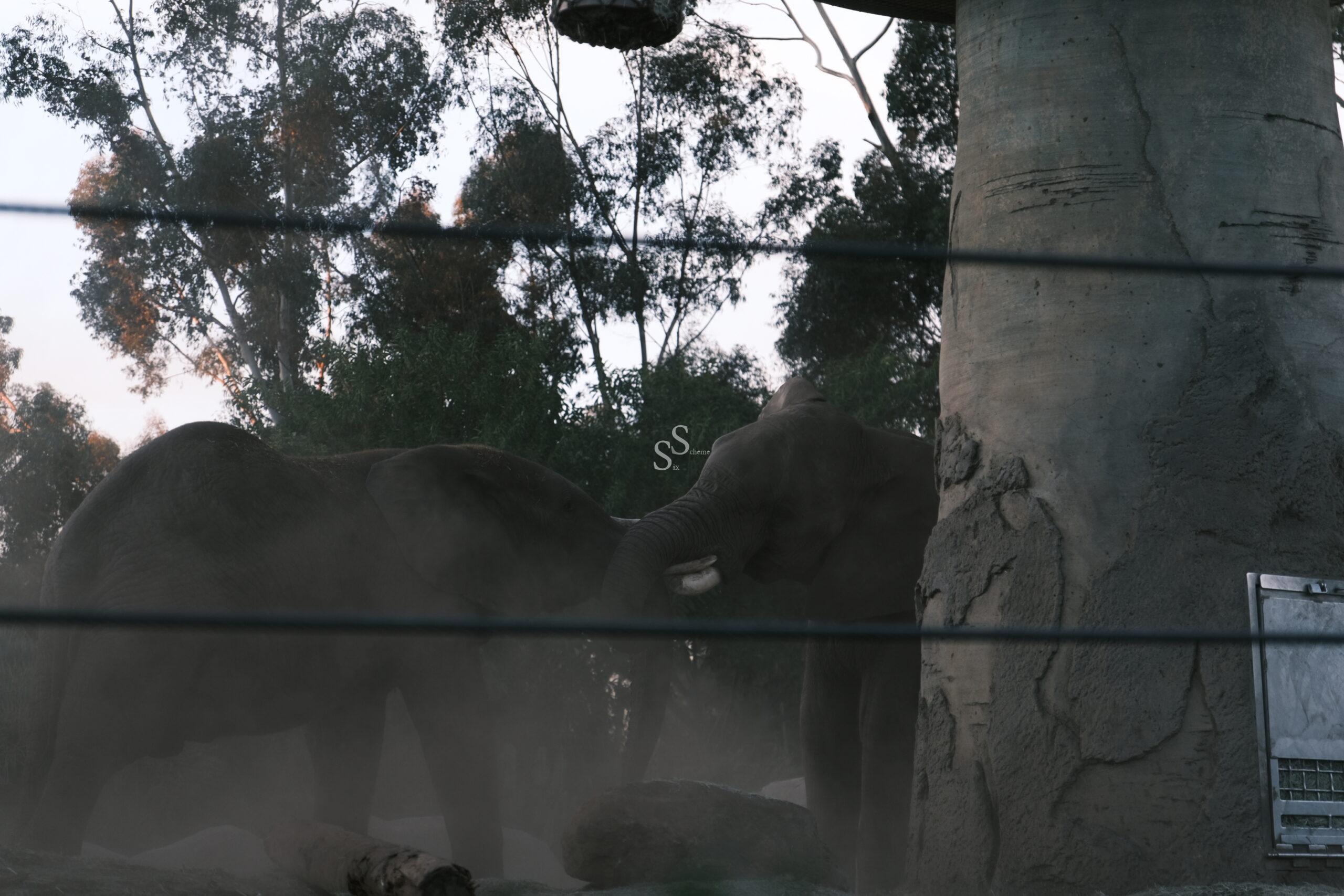 Two elephants stand close together near a large tree trunk in a zoo enclosure, surrounded by greenery and rocks. The elephants’ trunks are touching, and their tusks are visible.