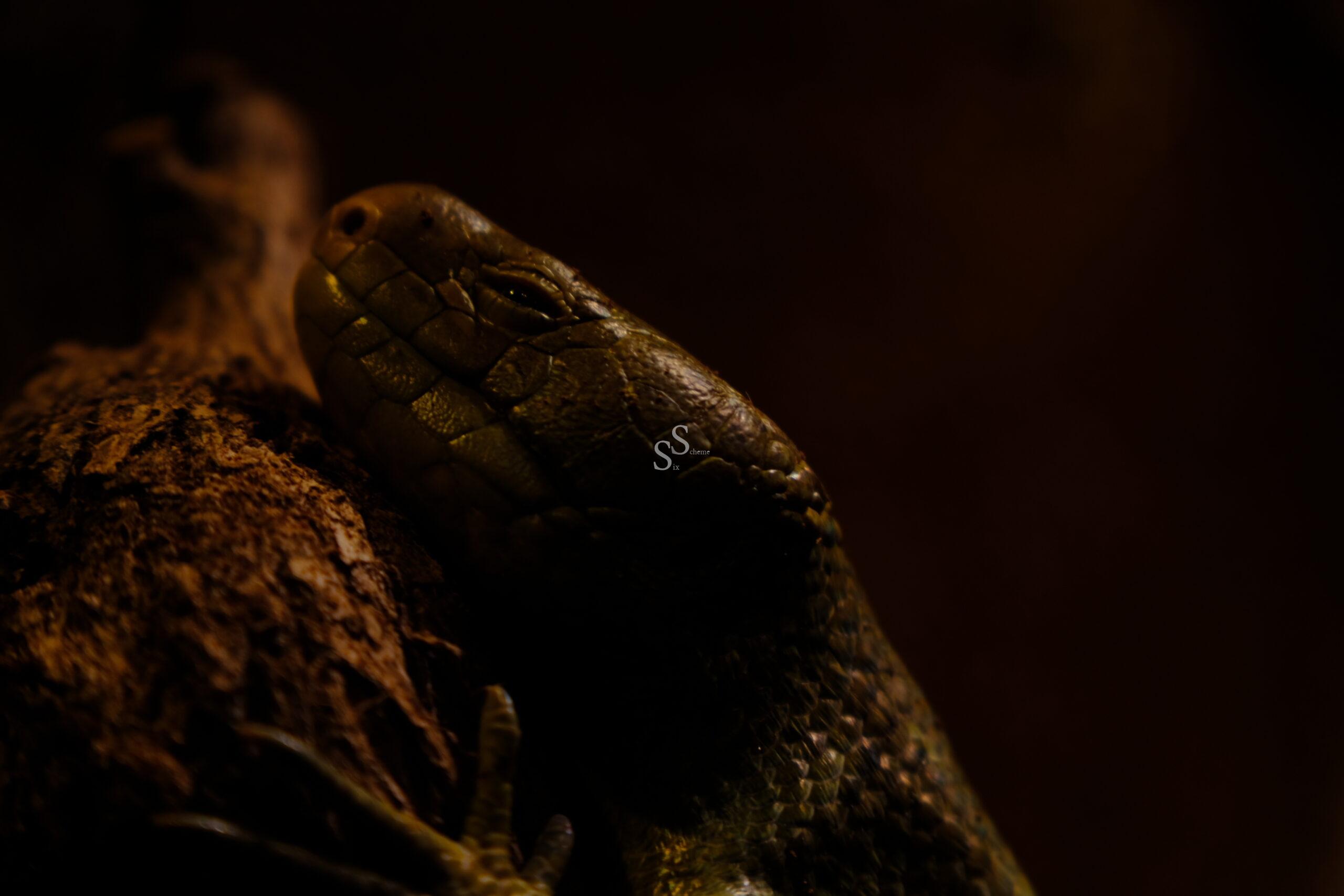 Resting quietly on textured wood under dim light, this close-up captures the detailed scales and facial characteristics of a reptile, possibly a lizard or snake, creating a moody, focused portrait.