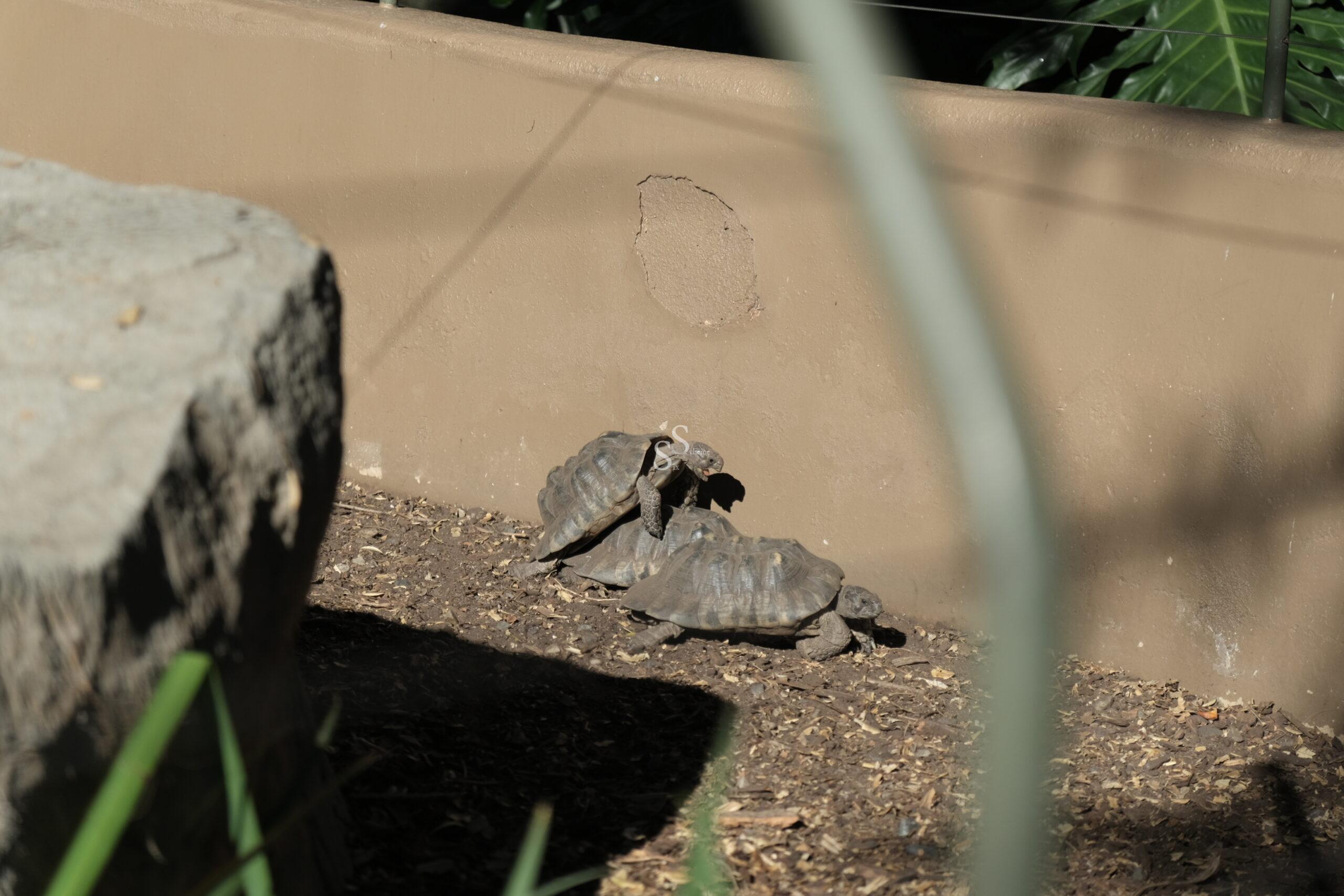 Three tortoises are close together on dry, dirt ground beside a tan wall. Part of...